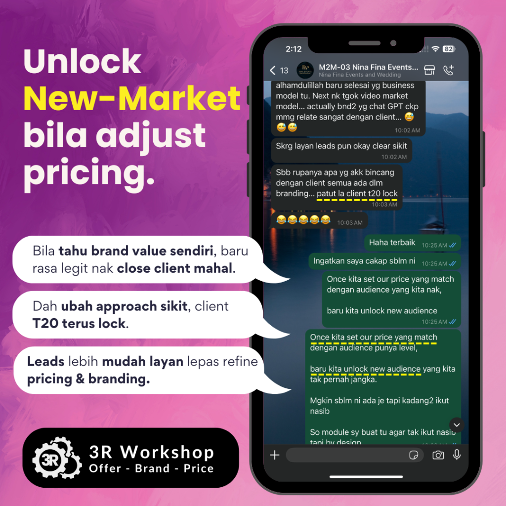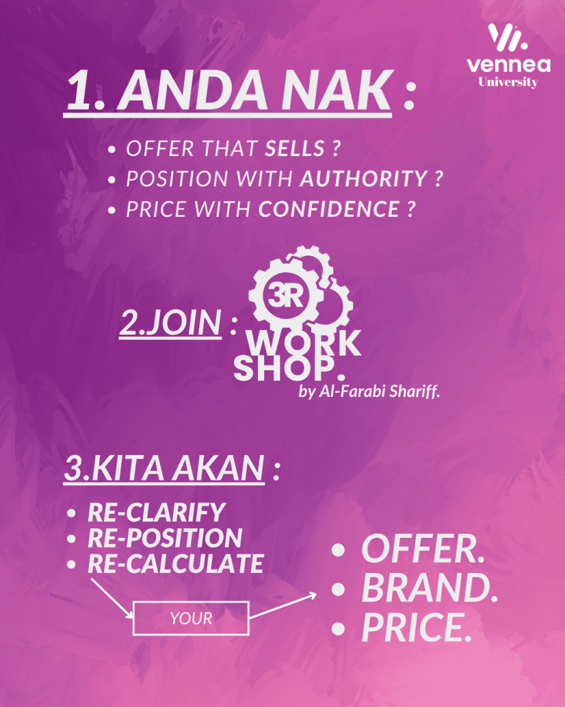 Itulah kenapa saya cipta modul ini – supaya anda boleh susun balik offer, pricing dan branding anda dengan lebih yakin dan sistematik.