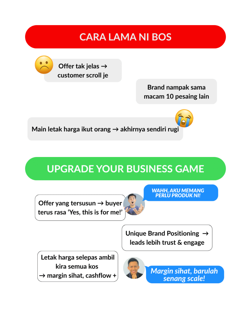 Sebab bila semua benda ni jelas, barulah sales senang naik, margin kekal sihat dan brand boleh grow tanpa terhimpit dengan persaingan & harga yang salah.